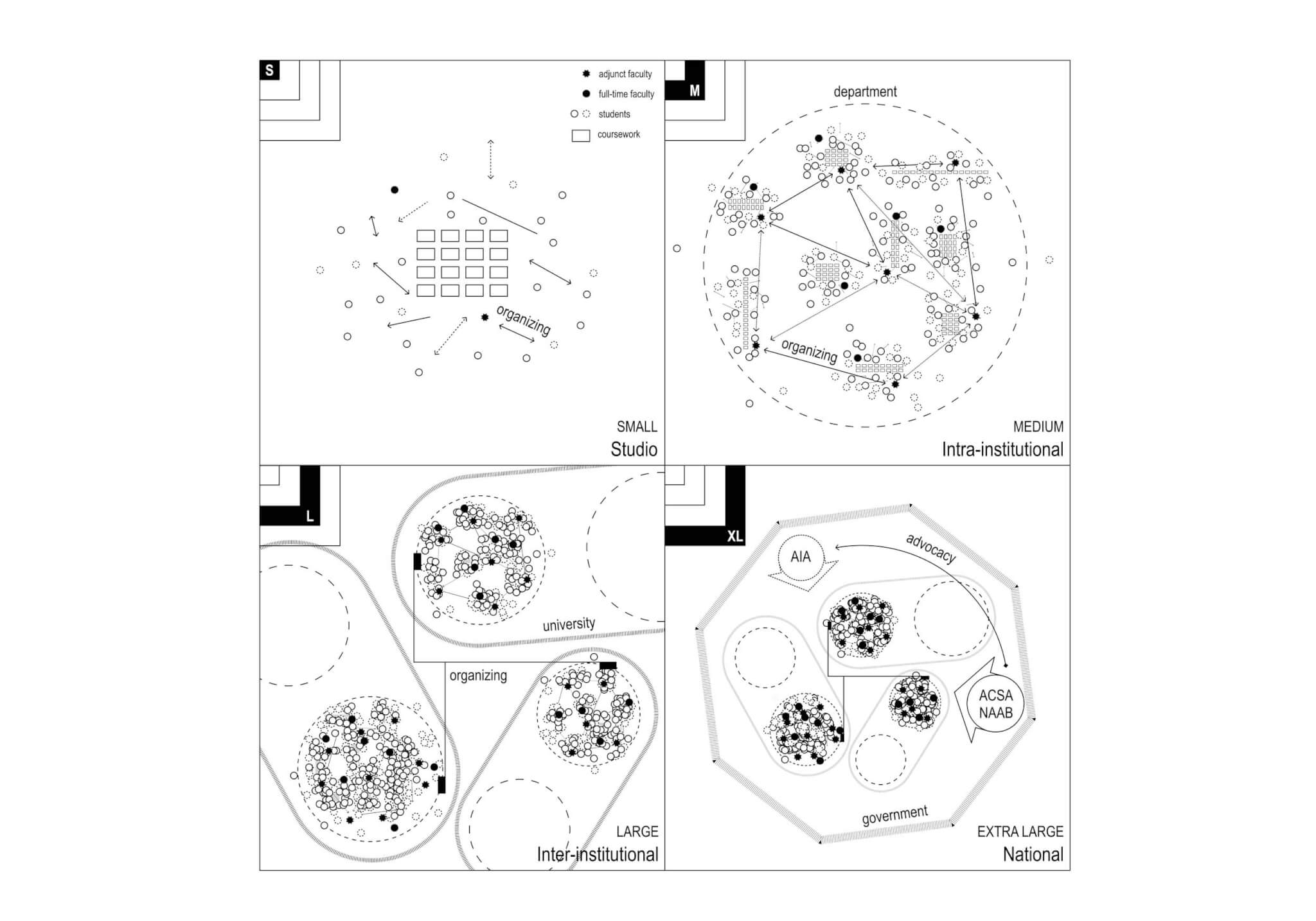 Esta dinámica intramuros se extiende directamente a la colaboración interuniversitaria. Los grupos escolares específicos se conectan con pares de otras universidades y construyen poder colectivo para influir en las organizaciones nacionales. Durante la Mesa Redonda de Architectural Alliance, los participantes recomendaron que la Asociación de Escuelas Universitarias de Arquitectura (ACSA) y la NAAB recopilen datos más detallados sobre las condiciones laborales a tiempo parcial en sus informes anuales. El Instituto Americano de Arquitectos puede brindar apoyo creando conciencia sobre cuestiones laborales. Estas medidas cierran la brecha entre las escalas media (sectorial) y muy grande (nacional), promoviendo un cambio de paradigma integral en la educación arquitectónica.