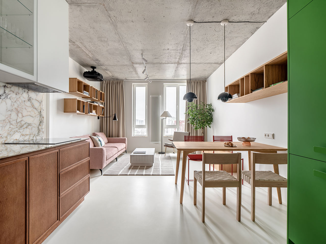 El diseño de este apartamento de un dormitorio es a la vez llamativo y significativo. Por ejemplo, los gabinetes de cocina verdes no solo son una pieza central visual audaz, sino también una unidad multifuncional que oculta electrodomésticos y espacio de almacenamiento. Inspiradas en el minimalista estadounidense Donald Judd, la mesa de la cocina y las estanterías mantienen una simplicidad limpia y sofisticada que contrasta con los elementos más texturizados y nostálgicos del hogar.