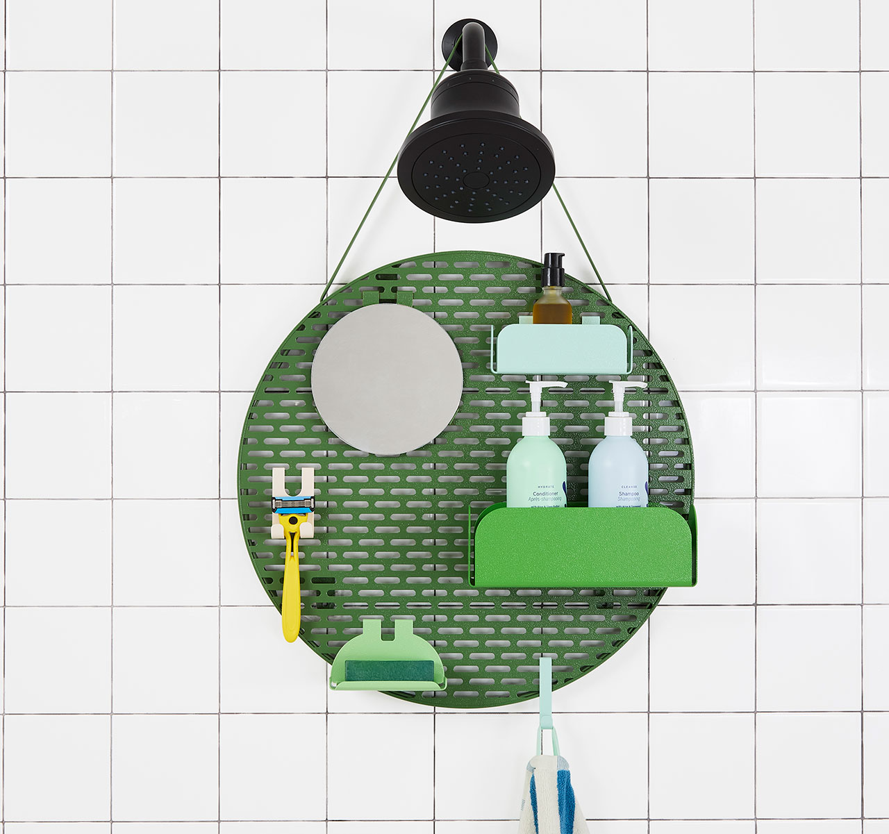 Hecho de aluminio corrugado, el lenguaje formal de Spot es industrial y duradero, pero su color evoca ligereza y fantasía. Los organizadores están adornados con accesorios coloridos e increíblemente versátiles, perfectos para cualquier cantidad de artículos que esperan ser guardados. Los accesorios incluidos son un conjunto básico de accesorios que puede necesitar mientras se ducha. Más allá de eso, hay muchos más complementos que encajarían en una casa o una familia más grande (o espacio para una bonita barra de champú). Las correas de los hombros son ajustables para garantizar la altura óptima del cabezal de ducha. Incluso se puede montar fácilmente en la pared si lo usa fuera de la ducha.