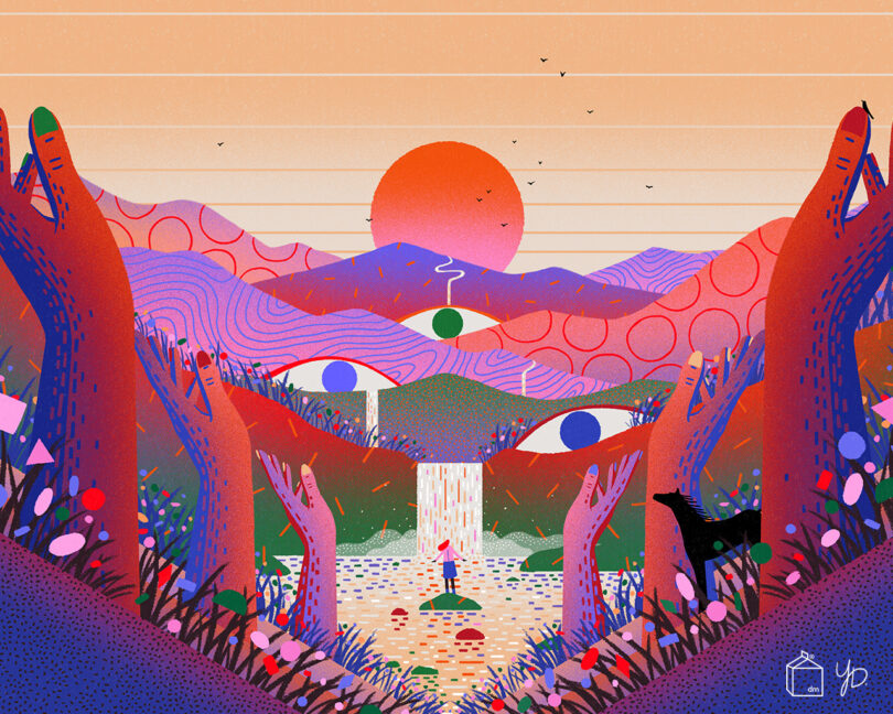 El diseño de escritorio de Du Shiyue no es una excepción. La naturaleza y el surrealismo chocan en esta vibrante ilustración. Patrones gráficos cubren las colinas y ojos misteriosos se asoman debajo de ellas. Las manos son un tema recurrente en el trabajo de Du, extendiéndose hacia arriba en primer plano como si brindaran una perspectiva abierta de infinitas posibilidades. Ya sea que esté ordenando su espacio de trabajo digital o simplemente desee un poco de creatividad, el arte de Du alegrará su día (y su pantalla).