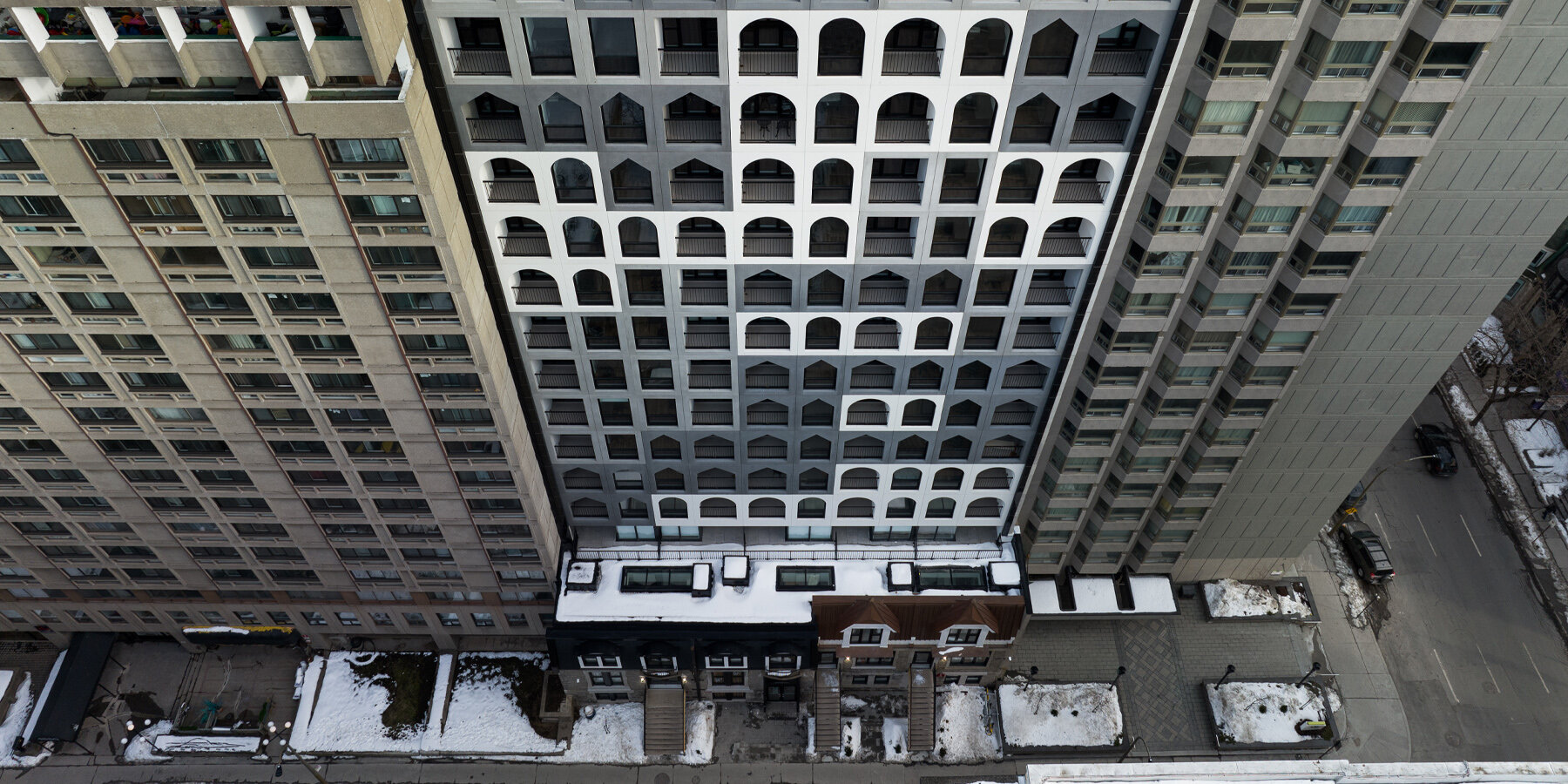 ACDF Arquitectura lanza LINK, un edificio de 19 pisos edificio de apartamentos en el centro de la ciudad Montrealdiseñado para satisfacer la creciente demanda de alojamiento para estudiantes. El estudio respeta el patrimonio de Shaughnessy Village, integrando la nueva estructura con la histórica época victoriana. pared exterior Personas que se quedan en la zona. En lugar de optar por la demolición total debido a su mal estado, ACDF trabajó para mantener la fachada intacta, sirviendo como puente entre el pasado y el presente y mejorando la identidad local. Este enfoque, aunque más costoso y desafiante, en última instancia beneficiará a la comunidad y promoverá el patrimonio arquitectónico de la zona, evitando el estigma del «fachadismo». El resultado es una variedad de buhardillas reinterpretadas, ensambladas como una colcha, que actúa como un cuadro.