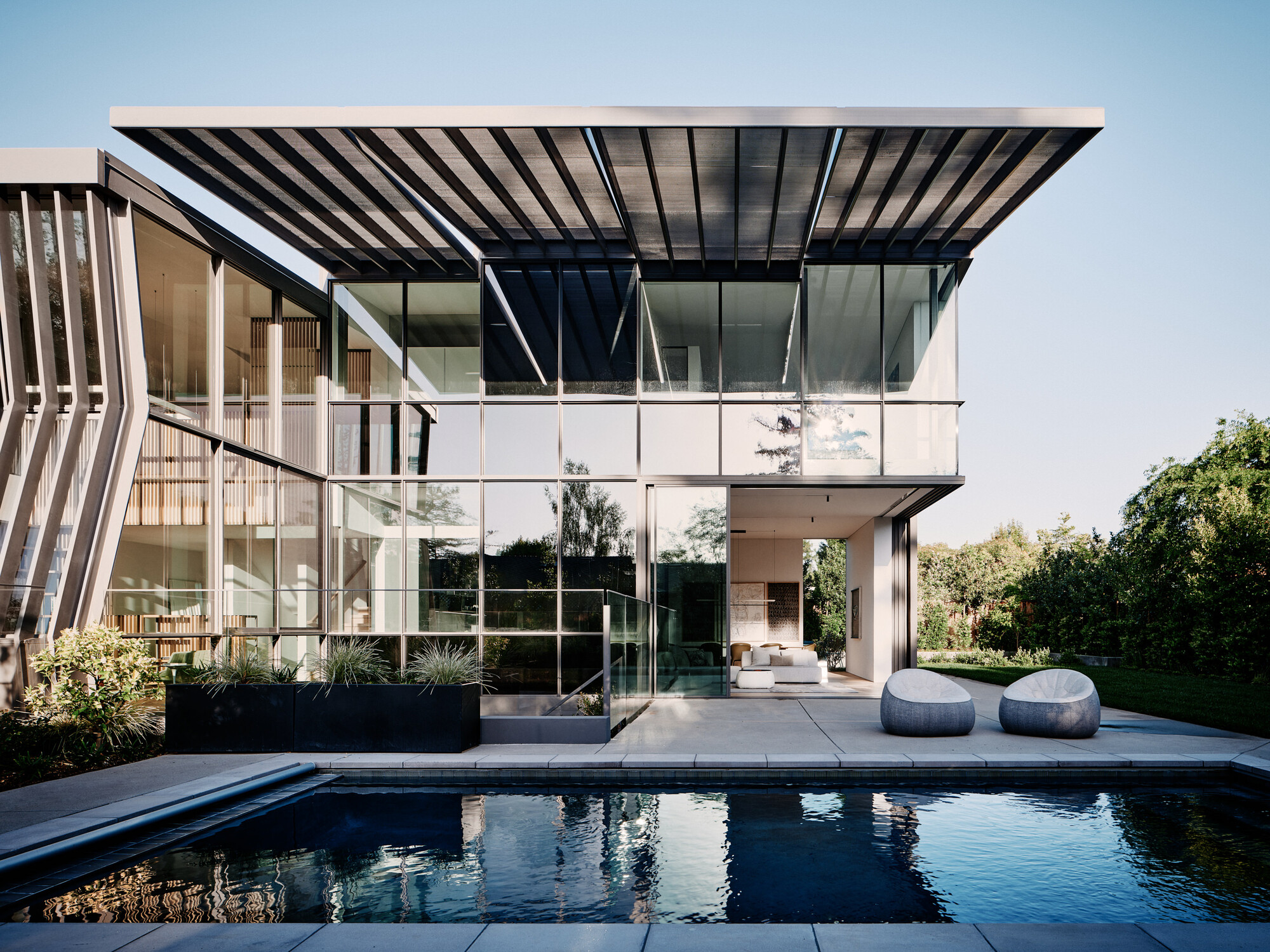 Desde la entrada a la biblioteca, el voladizo se pliega y sus aletas de aluminio caen en cascada a lo largo del exterior de la casa. Este techo es intencionalmente escultórico, intencionalmente abstracto y carece de artefactos de iluminación. En el interior, la llamativa estructura se puede ver en el segundo y tercer piso, y en el dormitorio principal, el techo está inundado de planos blancos. Un alero perforado de 16 pies proporciona la sombra que tanto necesitan la terraza y el dormitorio principal sin obstaculizar las vistas. Todas las puertas exteriores de cristal son retráctiles. Esta flexibilidad, combinada con la sombra proporcionada y la orientación solar de la casa, maximiza el flujo de aire y la ventilación cruzada, reduciendo significativamente la necesidad de control climático artificial.