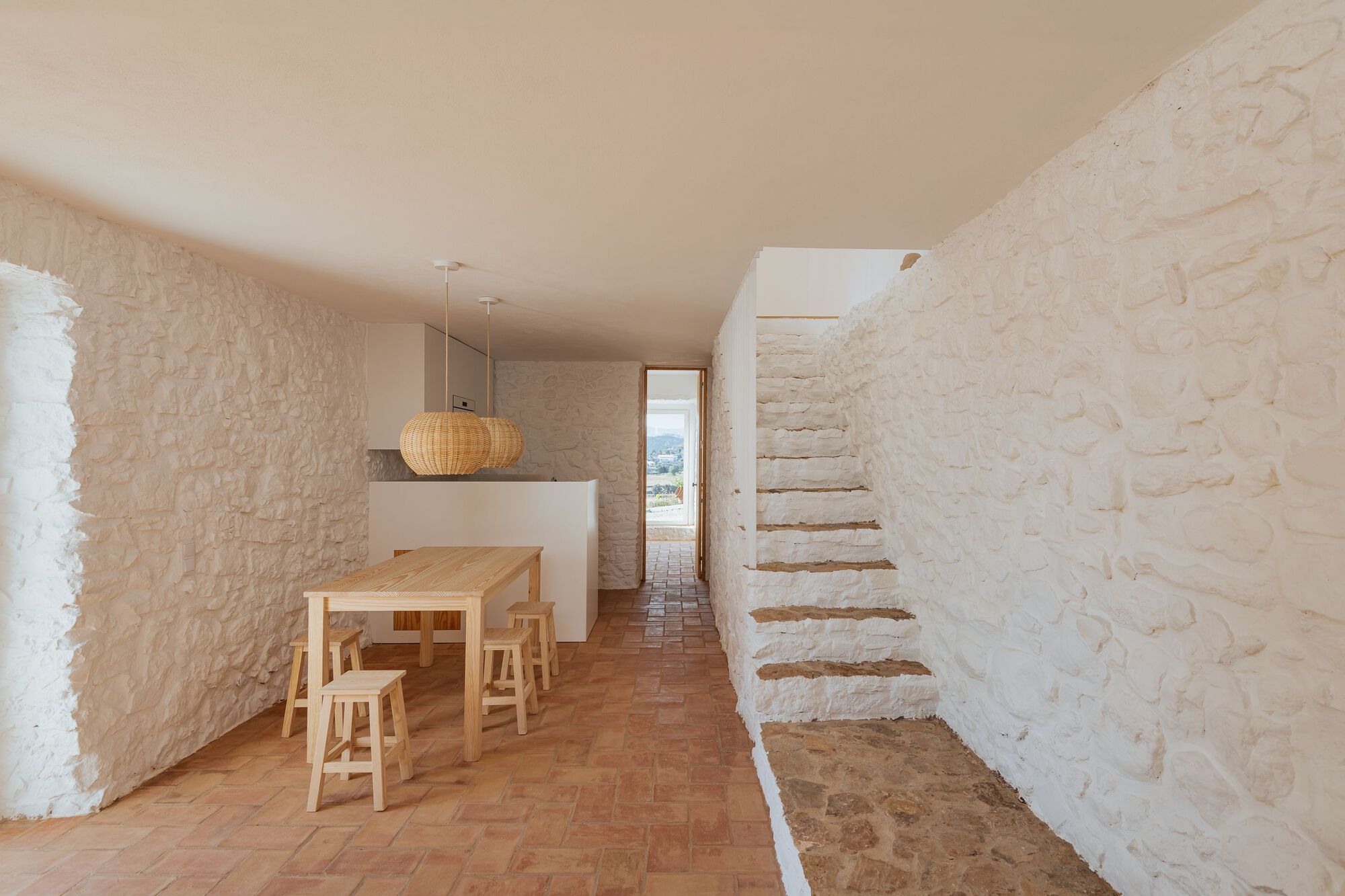 Los revestimientos del suelo están hechos de baldosas de terracota hechas a mano en cobertizos de barro tradicionales cercanos, y algunos detalles de la carpintería tradicional se reinterpretan en las puertas y contraventanas de madera de pino.
