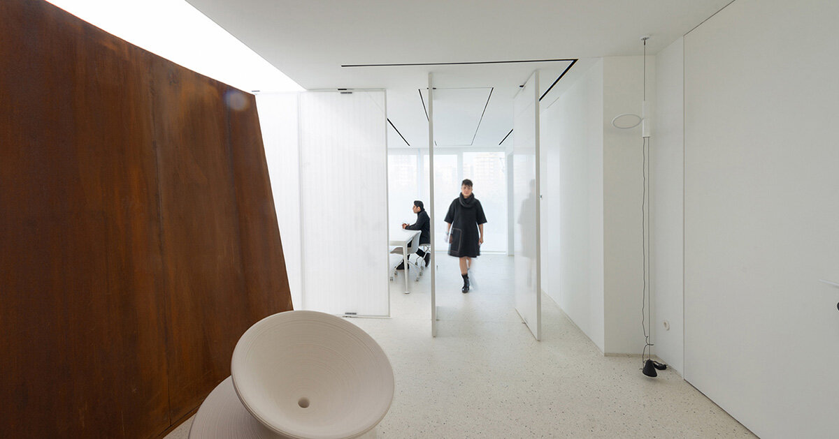 Ruida Arquitectos lanzó un espacio de oficina Compañía Comercial Faro, ubicada en Residencial El apartamento está situado en de estambul Distrito de Kadikoy. El equipo de diseño con sede en Teherán utilizó paneles acrílicos, un material elegido por su transparencia y su capacidad para crear una atmósfera acogedora y abierta, en línea con las necesidades del cliente. Diseñado para servir como oficina personal del CEO y área de reuniones principal, el esquema transforma el apartamento desordenado y con poca iluminación en un ambiente translúcido. Para mejorar la fluidez del espacio, el diseño organiza elementos funcionales a lo largo del eje Y, integrando estantes, cajones, gabinetes de cocina y cortinas en una capa lineal y translúcida que abre el espacio. El eje X presenta particiones acrílicas que crean celdas abiertas, cada una de las cuales alberga una función específica.