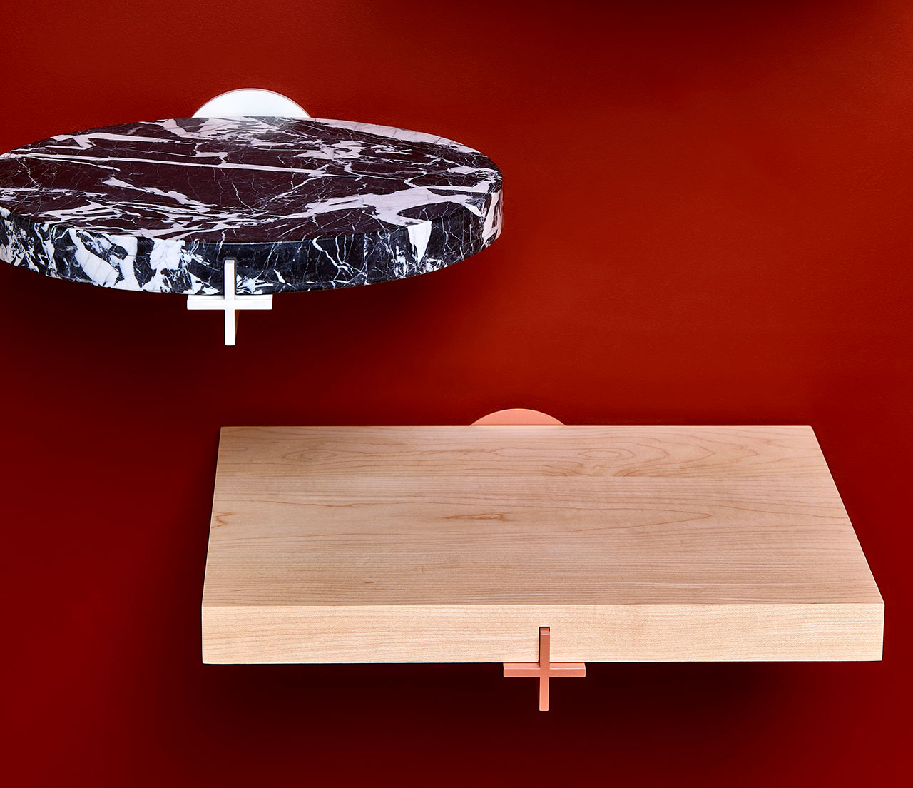 este Añadir mesita de noche Hay dos formas simples de estantes: cuadrados y redondos. También se pueden usar en diferentes partes de la casa para exhibir artículos en la sala de estar o en la entrada para guardar llaves y elementos esenciales del exterior. La complejidad de esta pieza radica en la facilidad de instalación y la calidad de los materiales. Los estantes están sostenidos por perfiles de aluminio en forma de plus relativamente delicados, fresados a partir de arce macizo de 1-1/4 de pulgada o roble blanco aserrado, que agregan cuerpo a los estantes. Además, los elementos están disponibles en cuatro colores a juego: hueso, arcilla, grafito y fucsia.