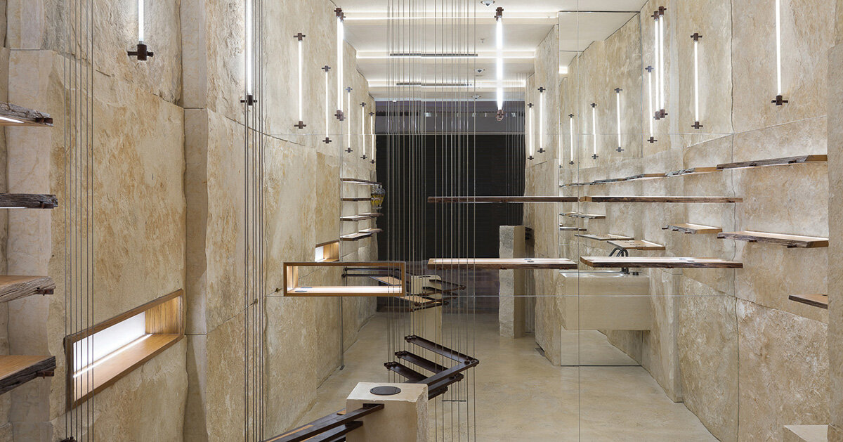 Diseño Dongqi Completa el primero espacio existir Llevar a la fuerza 15 ESSENTIALS, una marca centrada en la cultura aromática y los aceites esenciales. El equipo de arquitectos creó un ambiente relajante de aromaterapia mientras exhibía los productos de la marca. Muro de piedra natural, construido a partir de materias primas. Piedra El material fue seleccionado de la cantera para mantener su superficie texturizada, conservando rastros de minería y erosión. Estas rocas de forma irregular están dispuestas en pequeñas plataformas sobre las que crece musgo, dando la impresión de una formación natural. de madera Diseñados como un sistema de exhibición flexible, los estantes presentan textura de corteza y anillos de crecimiento, realzando las cualidades naturales del espacio. El sistema de estanterías está construido con pernos de hierro extraíbles que hacen eco de las cuñas utilizadas en las canteras, lo que permite ajustar y reconfigurar las tablas dentro de las paredes de piedra.
