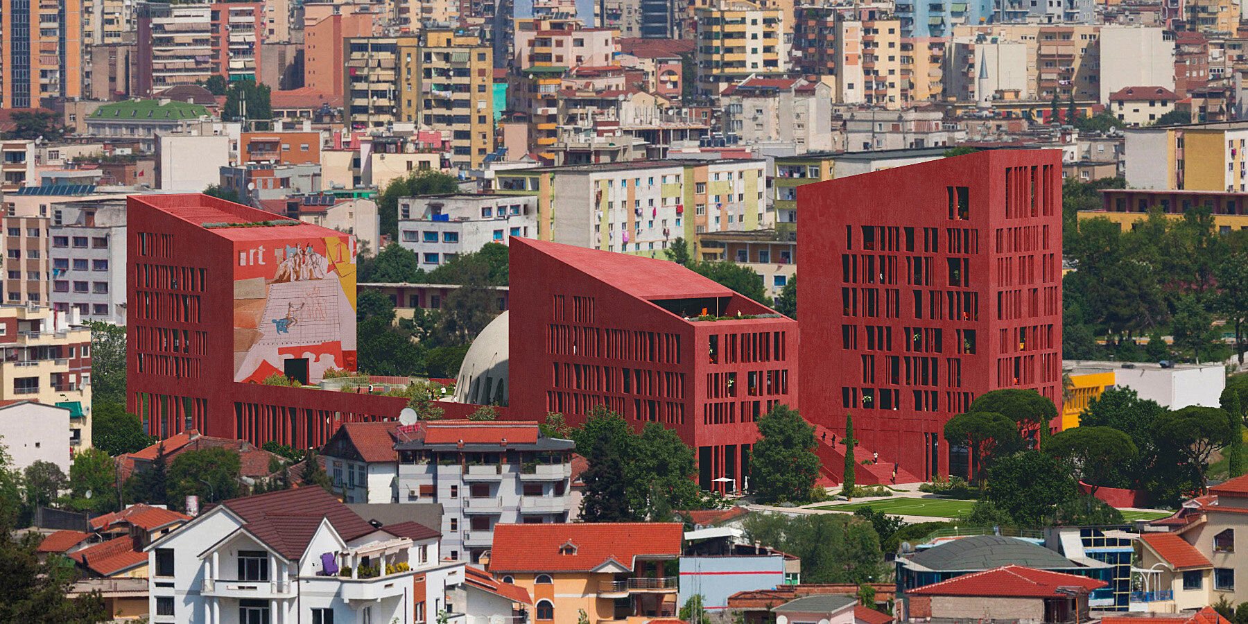 Al mismo tiempo, la elección de materiales, colores y texturas estuvo influenciada por el paisaje arquitectónico de Tirana, la historia de Albania y la ideología de la Unión Europea del Instituto Europeo. Por lo tanto, el edificio y las terrazas están construidos con hormigón texturizado de color rojo oscuro. Inspirado en la partitura de Oda a la Alegría, el diseño organiza inteligentemente los elementos estructurales y decorativos para crear una apariencia armoniosa, al mismo tiempo que actúa como una sombrilla para ayudar a moderar el clima del edificio. La fachada que da al zoco es lisa y sólida, lista para murales de cuerpo entero creados por artistas locales que serán visualmente interactivos. La cúpula central está hecha de hormigón color arena y está rodeada por arcos de diferentes tamaños que aportan interés visual y conectan los espacios interiores y exteriores.