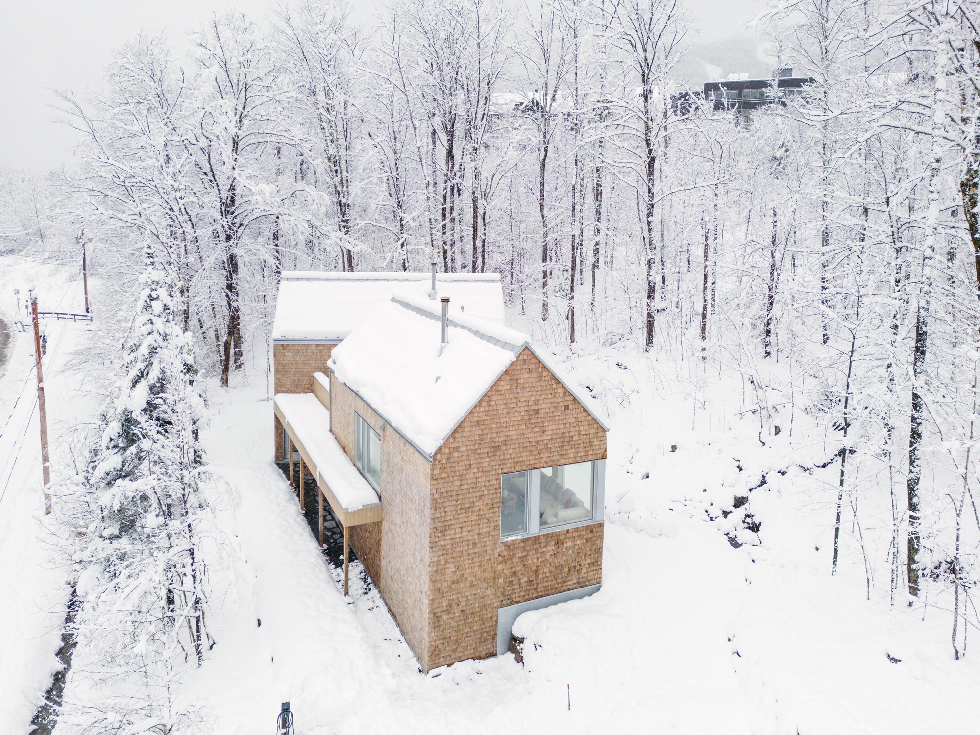 En el primer piso hay una entrada estilo vestíbulo y un área para dormir para guardar equipos de ejercicio. Estas habitaciones cuentan con dormitorios sencillos y pueden alojar cómodamente a varias personas. La sala de estar de arriba es abierta y luminosa. El techo de la catedral ofrece excelentes vistas, con una serie de ventanas que enmarcan las vistas del Monte orford. Ambas cabañas tienen acceso a una terraza exterior compartida con spa en el techo del volumen central.