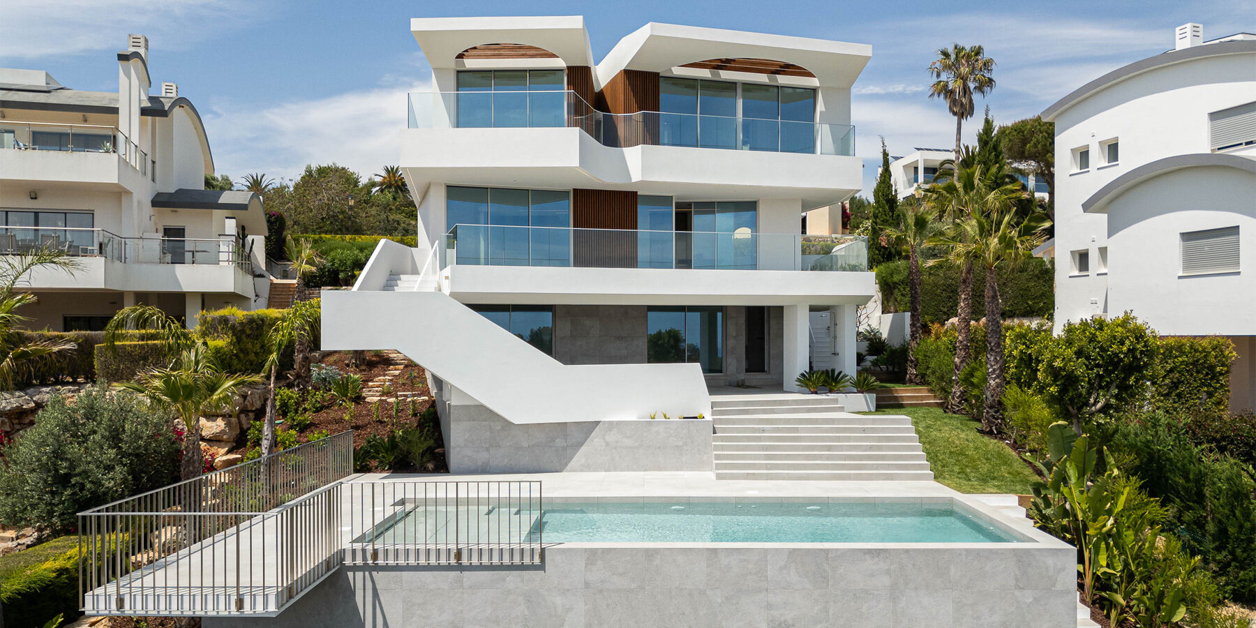 Situada en la costa occidental del Algarve, Villa Fortaleza fue diseñada por Vieira de Moura Architects como una residencia con doble personalidad. Línea de precaución del norte frenteTranquilo e íntimo, contrasta con la grandeza de la fachada sur, donde el volumen continúa expandiéndose y desplegándose en formas majestuosas. Fotógrafo: Ivo Tavareseste propiedad Abarcando tres plantas, las terrazas se extienden hacia el horizonte como brazos abiertos, sus geometrías no sólo se adaptan al entorno sino que se fragmentan en un discurso arquitectónico con el mar y el paisaje.