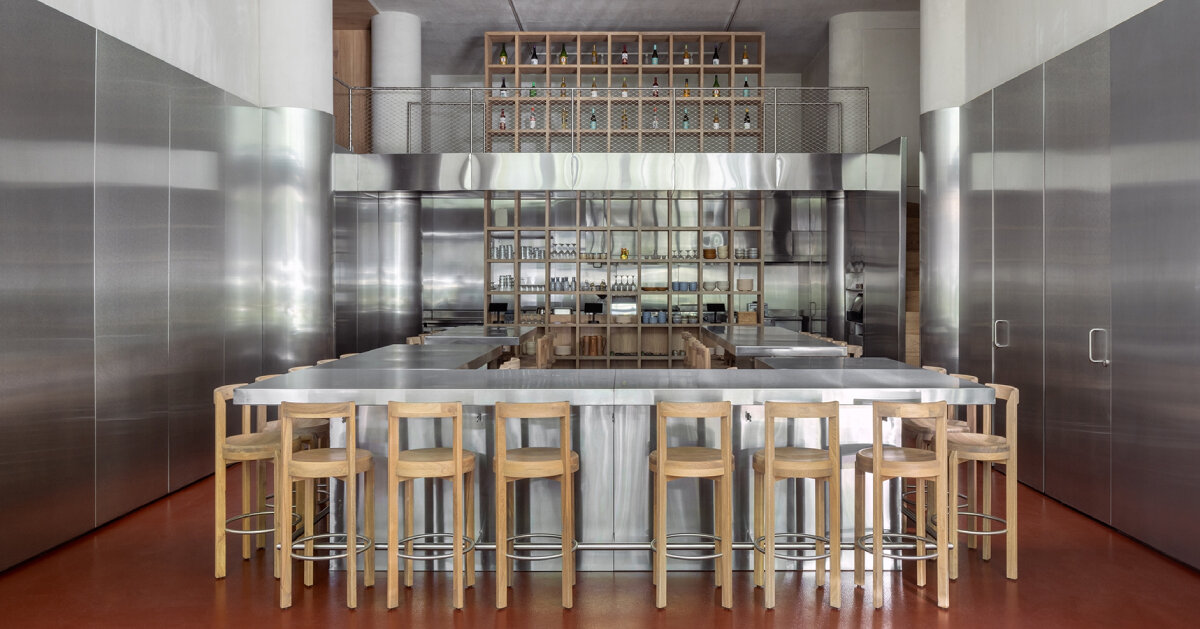 Paneles de acero inoxidable cubren las paredes perimetrales del restaurante, definiendo el mobiliario de la cocina, la barra del comedor y la distribución general. Los suelos con revestimiento epoxi en color ocre antideslizante contrastan con las frías superficies reflectantes, añadiendo calidez y profundidad al espacio. Estos materiales se combinan para crear una atmósfera similar a la de una cocina donde los comensales pueden participar activamente en una experiencia gastronómica compartida. Cada reflejo del acero inoxidable añade color y vitalidad al ambiente minimalista.
