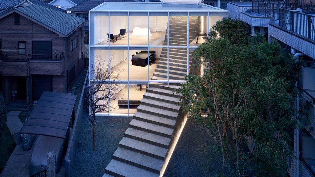 una enorme falsificación escaleras es el centro de la casa Tokio diseñador haciendoque se extiende abruptamente desde el jardín trasero a través del muro cortina de vidrio hasta el techo.