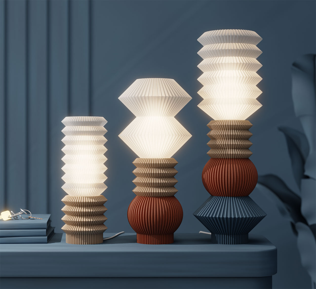 Estas pantallas forman un majestuoso difusor de estilo de mediados de siglo que conforma la lámpara modular STAK. La lámpara añade un toque de calidez a las bombillas de filamento estándar y encarna los principios del diseño escandinavo de calidez, comodidad o «hygge». Algunas estrellas brillan en una paleta relativamente tenue: un rico mod terracota, otro de un azul polvoriento. Estos tonos incluyen ocre, musgo, pizarra y arena, que juntos forman una colección creativa cohesiva.