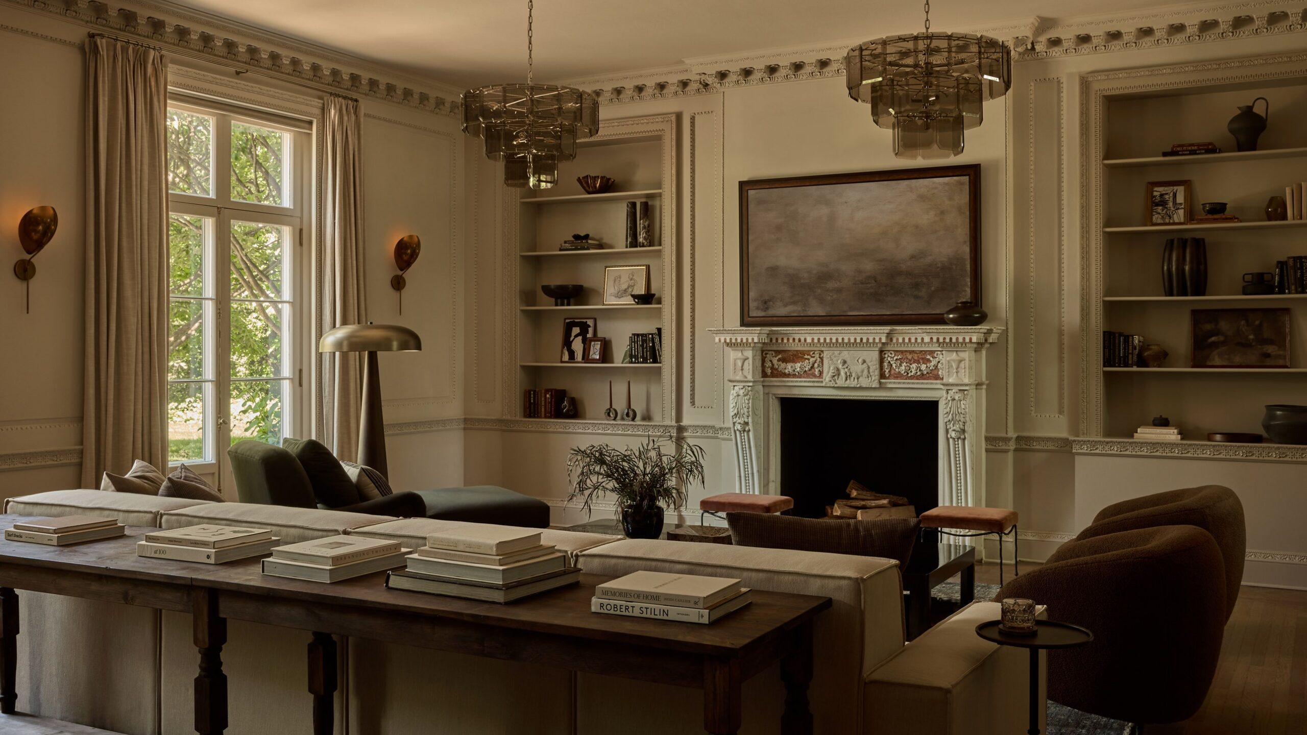 La pareja recibió ayuda. casa halton Realizar cambios en el sitio web. La firma de diseño buscó restaurar gran parte del auténtico estilo del siglo XX de la casa y al mismo tiempo agregar un toque contemporáneo. Se renovaron puertas curvas personalizadas, chimeneas existentes y murales de yeso tallados a mano. Se conservaron y renovaron los gabinetes originales en ciertas áreas de la casa, mientras que las escaleras de mármol y los detalles festoneados en otros lugares se conservaron cuidadosamente. Pero el equipo de diseño también introdujo una gama de toques interiores atrevidos para adaptar el plano de planta a la vida moderna.