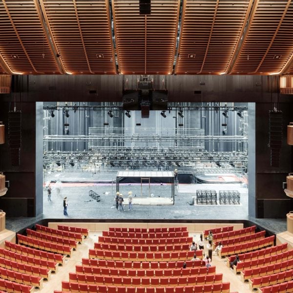 En la sala central, el patrón arqueado continúa en el techo y las paredes curvos, que están acabados con estrechos listones y paneles de roble como parte de la estrategia acústica.