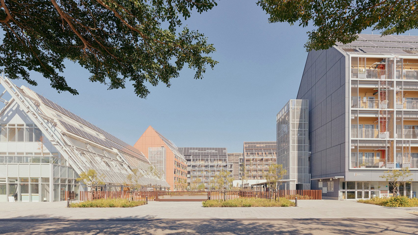 Cada bloque tiene paneles solares en su techo a dos aguas, y los bloques de instalaciones inferiores están rematados con un techo con estructura de acero con recortes que crean terrazas en los pisos superiores.