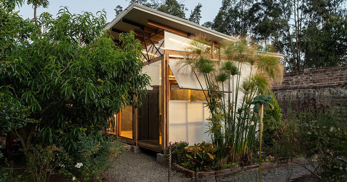 Diseñado por el estudio de arquitectura Quinta Fachada, Taller Atemporal es un espacio multifuncional de 18 m2 pensado como zona de coworking, showroom, taller de proyectos y edificio. oficina En Ibarra, Ecuador. laminado madera Estructura cubierta, elegida por su bajo impacto ambiental, durabilidad y eficiencia energética. La madera procede de forma responsable de bosques certificados, prefabricado para acortar el período de construcción. El policarbonato y la paja protegen el edificio del ruido y las inclemencias meteorológicas, aislándolo pared exterior. Los paneles OSB de bajo mantenimiento recubiertos internamente con microcemento brindan durabilidad mientras están templados Vaso Un lado de la fachada está abierto al paisaje.