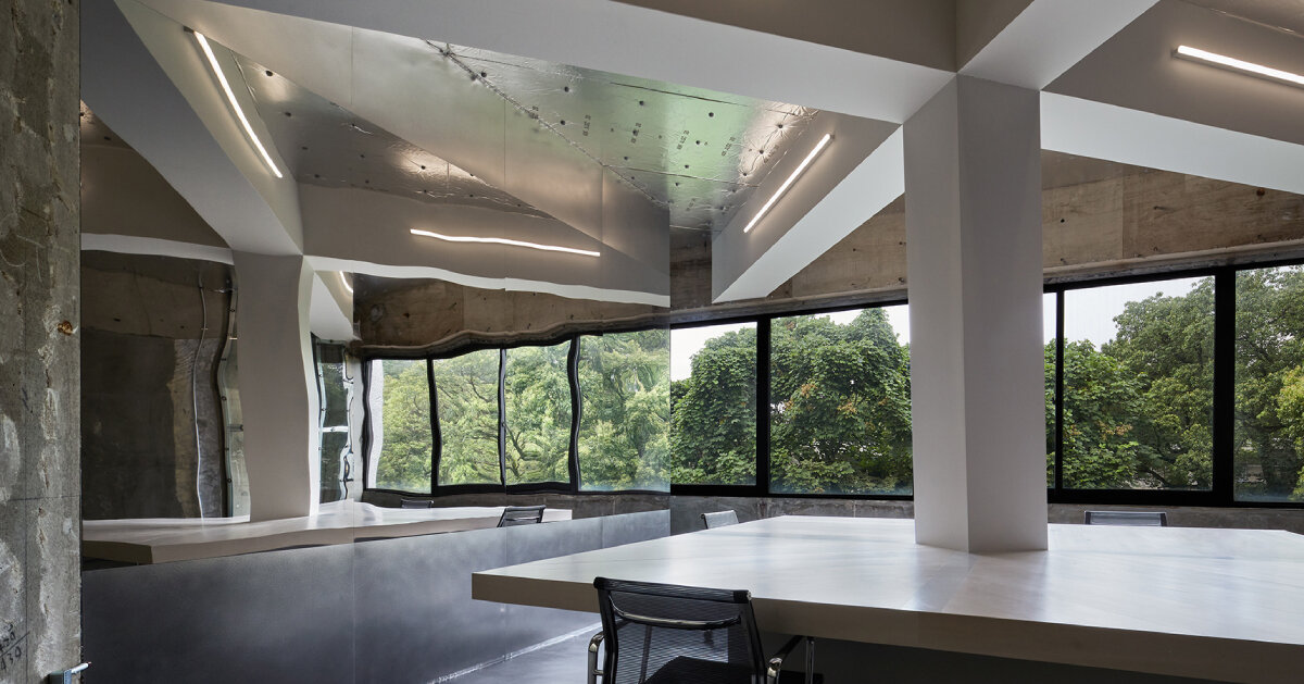 Para hacer frente a las limitaciones de espacio, ULTRA STUDIO transformado un estrecho Tokio Divida el espacio de la oficina instalando un escritorio grande y permitiendo que los empleados se reúnan y trabajen juntos. El concepto de diseño reinventa cómo varias empresas pueden compartir un compacto espacio de trabajo, Incorpore vigas y columnas artificiales para organizar la oficina manteniendo un entorno abierto y colaborativo. Frente al verdor del barrio Akasaka El diseño de la Villa Real maximiza la funcionalidad y el confort en una planta triangular retorcida.