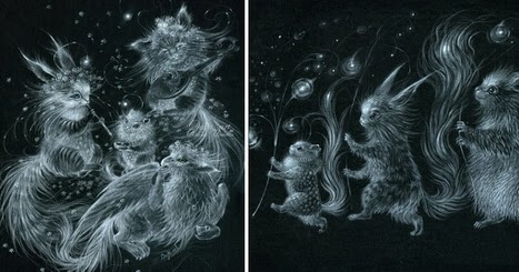 Me encanta la ejecución de estas ilustraciones. No son sólo líneas de lápiz blanco, parecen finas y delicadas volutas de humo. La aplicación del color no hace más que realzar la sensación de calidez del mundo misterioso y de las criaturas a las que somos invitados.