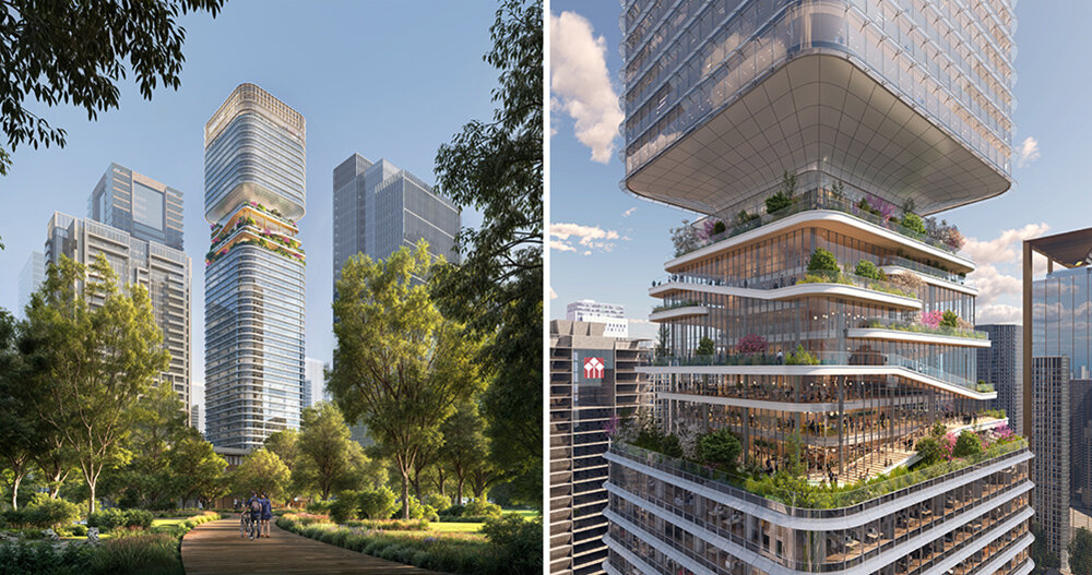 Tres áreas recreativas llenas de naturaleza incluyen un vestíbulo elevado, un jardín en la azotea y un podio escalonado.