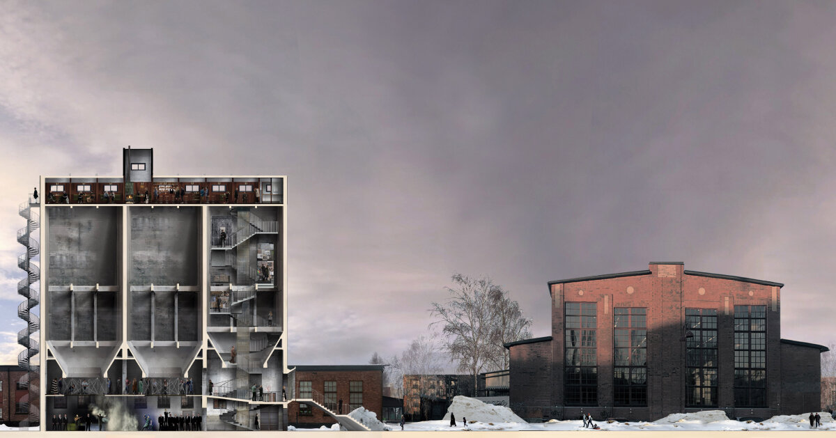 SKC: AaltoSiilo es un edificio extremo y aparentemente imposible: no está diseñado para personas sino para procesos; un edificio de hormigón de 28 metros de altura sin ventanas ni aislamiento. Al ser la primera nave industrial de Alva y Aino Alto, se trata de un edificio protegido, lo que limita su tratamiento.