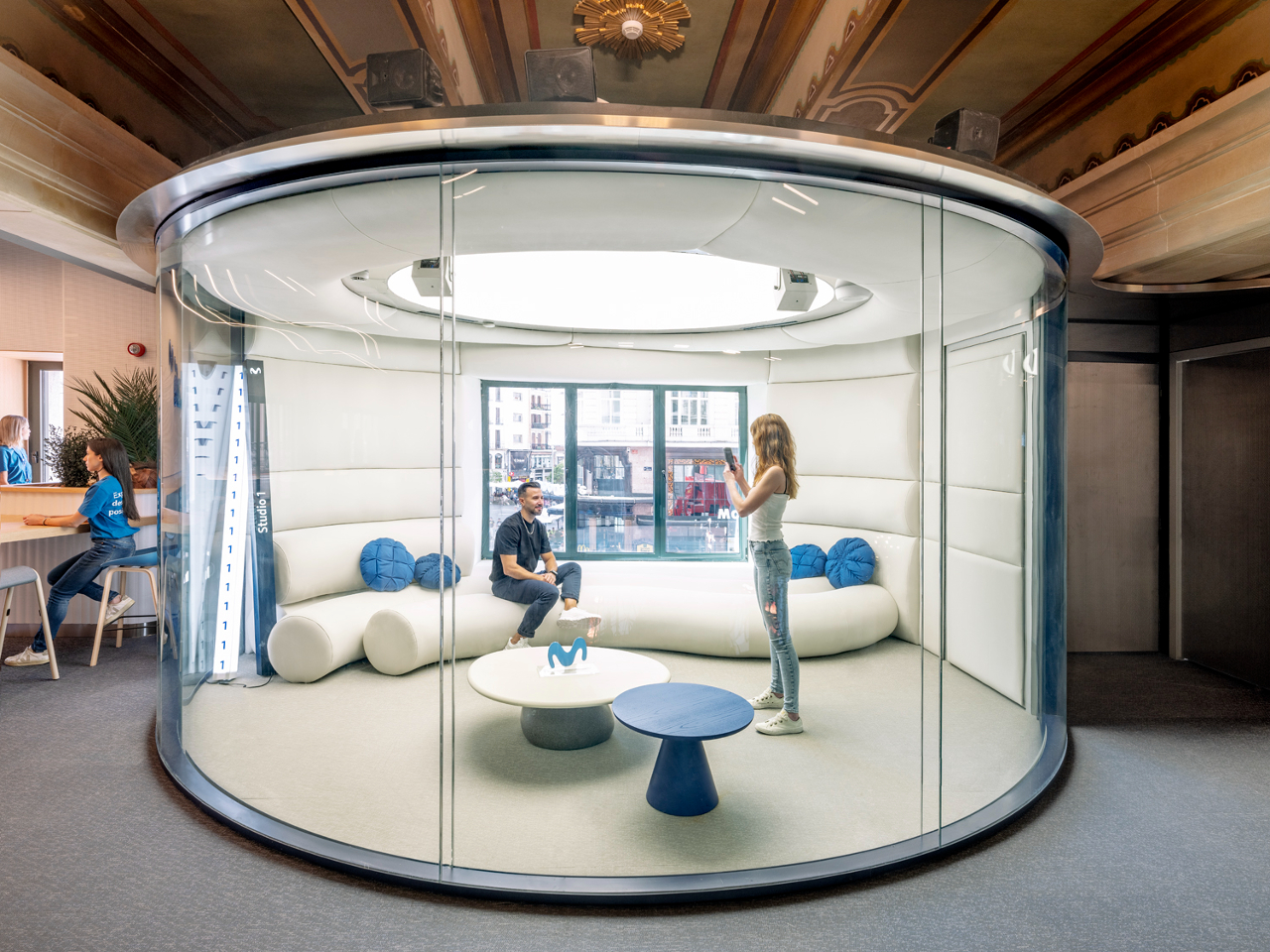 estudio de plátano La tienda fue rediseñada en colaboración con Puentes de diseño y socios. Los arquitectos siguieron un riguroso proceso de renovación que destacó el edificio patrimonial y al mismo tiempo creó un entorno contemporáneo que refleja la historia de Telefónica. “Queríamos recuperar la esencia del espacio original y al mismo tiempo presentar el futuro”, dijo el gerente general de Banana Studio, Matías Rodríguez.