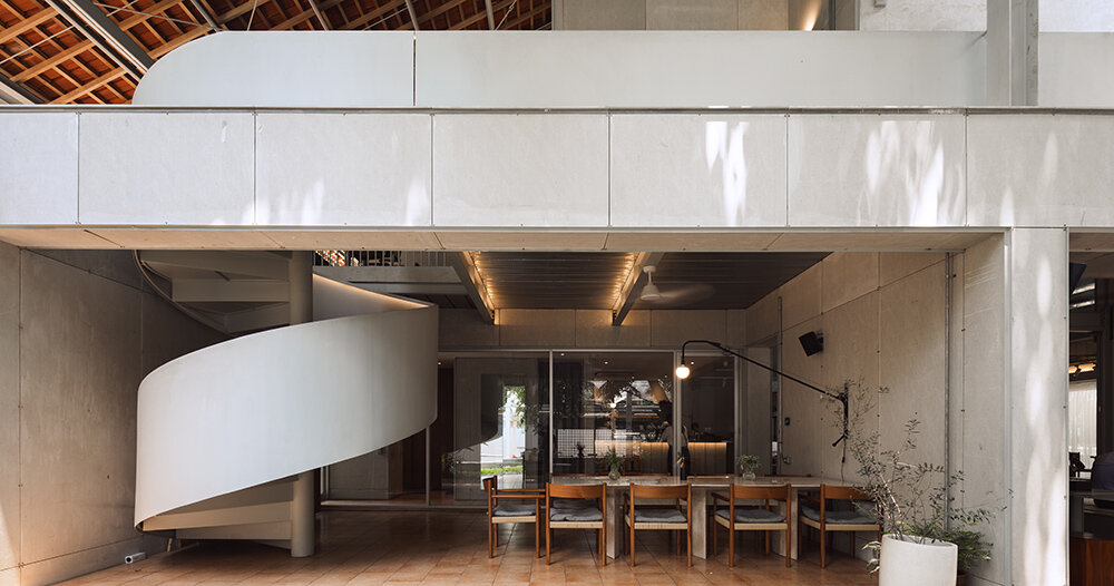 Una característica única de Titik Temu Café es su techo escalonado; equipo El diseño de Platform Architects aumenta la capacidad de asientos de la cafetería y crea un ambiente único para los visitantes. Ubicada a la vista de los imponentes rascacielos de Yakarta, esta azotea invita a los huéspedes a disfrutar de una cena al aire libre en las copas de los árboles mientras se sumergen en el entorno urbano. El diseño utiliza paneles de vidrio entre cada piso para garantizar que la luz natural penetre en el interior durante el día y al mismo tiempo reducir la ganancia directa de calor. Mientras tanto, el techo a dos aguas tiene un propósito práctico al gestionar el escurrimiento del agua durante la temporada de lluvias, lo que demuestra la respuesta considerada del arquitecto local al clima local.