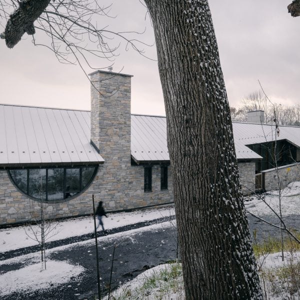 En planta, la casa es una barra larga con un dentado Formado a lo largo de un lado. Las paredes están revestidas de piedra y madera de cicuta, y el techo de la casa es metálico. aguilón techo.
