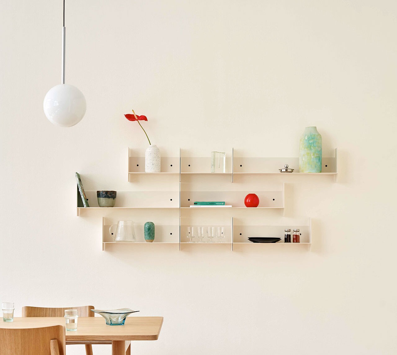 Sobre estantes de pared de acero PLI de TIPTOE, apoyados contra una pared clara, se colocan dos tarros de cristal llenos y dos vasos vacíos.