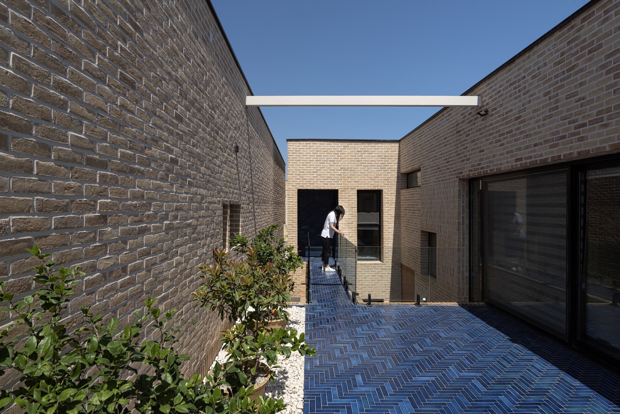 A continuación, el patio central (al que los clientes se refieren como el Patio Naranja después de su experiencia de vivir en la casa) desempeña el papel de un patio exterior en las tradicionales casas con patio de dos patios de Yazd, debido a la función del terreno. En el primer piso, la casa principal sirve como área interior de una casa tradicional en Yazd y se concibe como un lugar activando el patio interior (llamado Patio Azul por los clientes según su experiencia de vivir en la casa). . La altura mayor que la planta baja lo aleja de su forma tradicional y transforma el límite físico entre él y el patio central (exterior) en un límite verticalmente abierto.