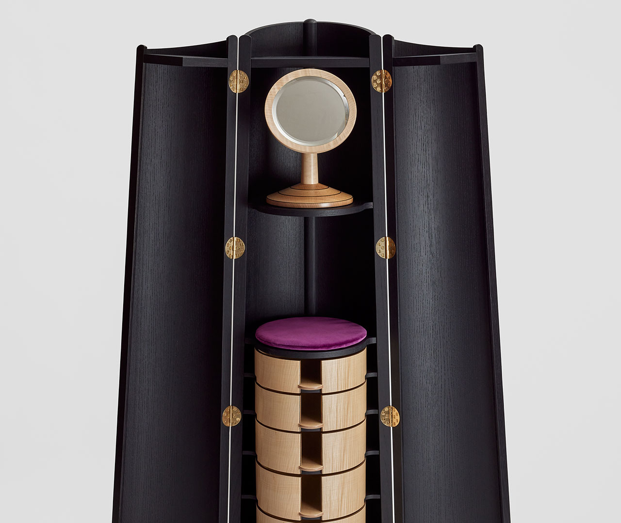 Makepeace tiene un historial de desafiar tipos de gabinetes, diseñando diseños como gabinete lateral Pliegues parecidos a plumas o caja de flujo Detalles de madera tallada con ondas de agua. Obelisk 3 es la última incorporación y destaca por su exterior de roble negro, que irradia una estética audaz y moderna. En el interior, la madera de sicomoro ondulada clara crea un contraste visual y táctil que es a la vez inesperado y agradable. La yuxtaposición de materiales distingue lo conocido de lo desconocido, lo visible de lo oculto. El estante superior alberga un espejo hecho a medida que se extrae y ajusta su ángulo a la altura del usuario. Directamente debajo, un rico cojín fucsia proporciona un suave aterrizaje para accesorios delicados, detrás del cual hay seis cajones para almacenar y catalogar artículos por altura.