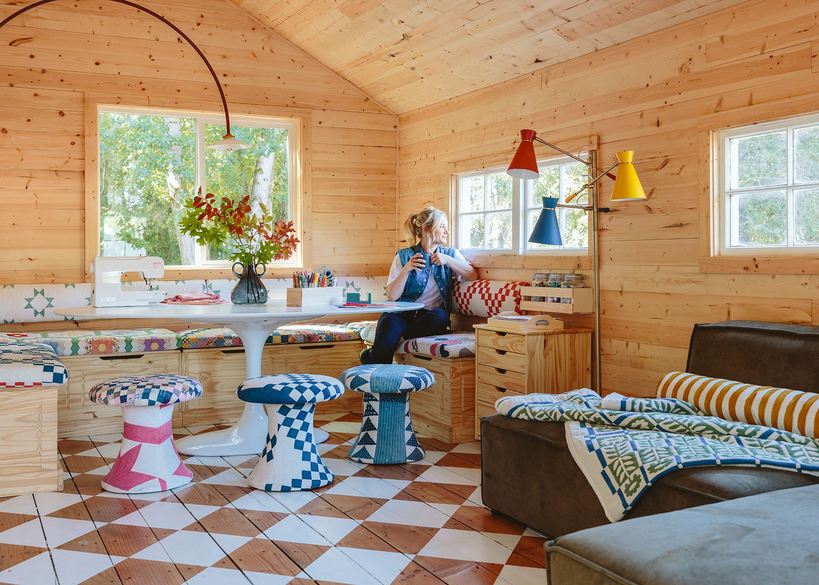Retapizamos todos los taburetes, bancos y cojines con edredones antiguos que había atesorado/coleccionado a lo largo de los años (Lea una publicación al respecto aquí.). mesa de tulipanes Realmente es el único que existe que encaja: necesitamos una base para no tener que intentar hacer malabarismos con un montón de patas. Necesitábamos un óvalo para navegar mejor por el dispositivo integrado, y hay muchos óvalos que son demasiado pequeños o demasiado grandes, pero este (de AllModern) es exactamente lo que quiero. También me encanta la yuxtaposición del pino rústico con la mesa de tulipanes blancos estilo Saarinen de mediados de siglo. Encaja perfectamente.