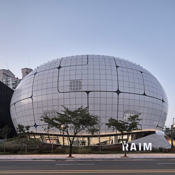 El Museo de Robótica e Inteligencia Artificial (RAIM) en Seúl tiene una forma única, que el estudio pensó que podría hacer que los transeúntes se preguntaran «¿es esto una nave espacial?»