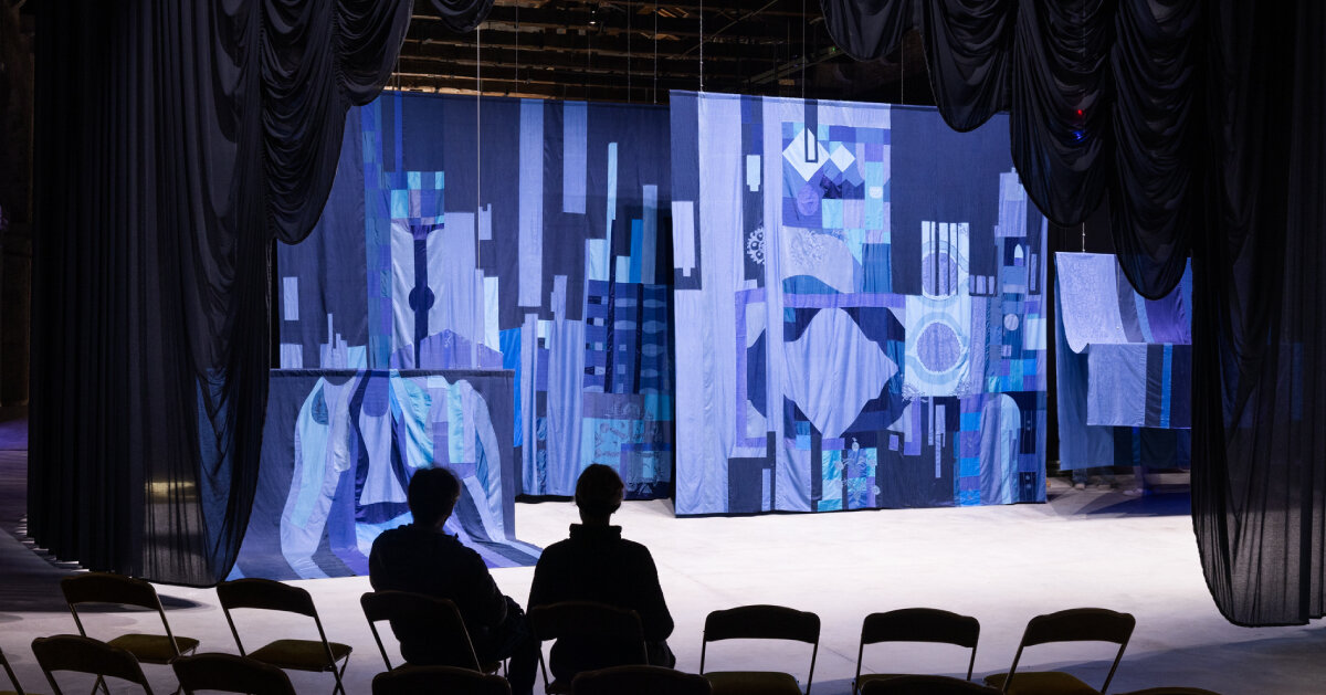 Caminando entre tonos azules, patchwork tapizSusana bordadoPabellón de Uzbekistán La 60ª Bienal de Arte de Venecia Es un escenario teatral para voces colectivas y memorias culturales. La artista Aziza Kadyri transformó el pabellón, Don’t Miss a Tip, en un teatro deconstruido entre bastidores: una sala arrinconada y con poca luz llena de montones de disfraces de adultos, booms reconfigurados y pantallas digitales. Los visitantes serpentean a través de un viaje sensual pero ambiguo, que culmina cuando emergen en un escenario abierto iluminado por focos y activado por las miradas de los miembros de la «audiencia» en reposo, un guiño al reconocimiento de la experiencia teatral de Card.