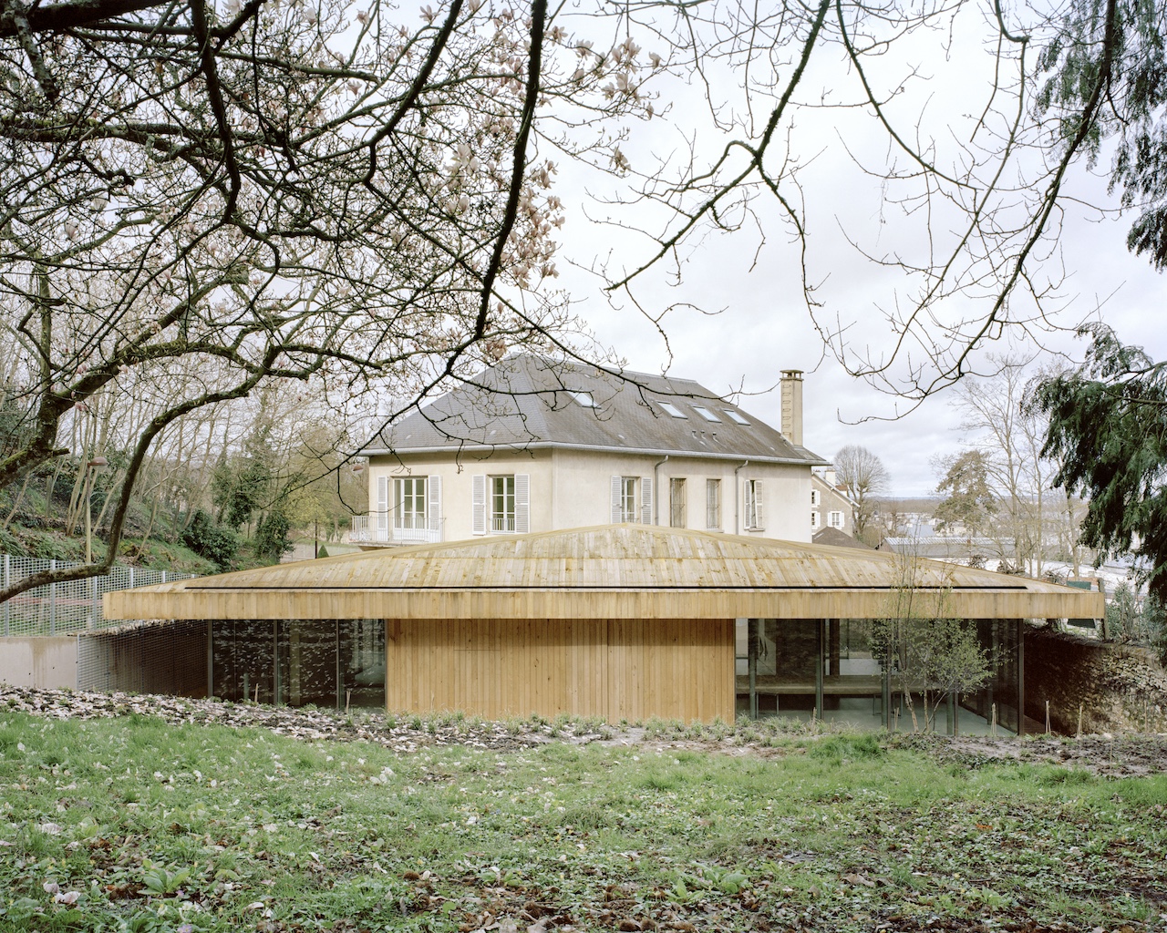El tejado y las fachadas están construidos con madera de origen local, concretamente de castaño, cuidadosamente procesada para satisfacer las necesidades del proyecto. La madera proviene directamente del bosque de Versalles y su preparación requirió un cronograma estricto para adaptarse al tiempo de secado requerido por el material.