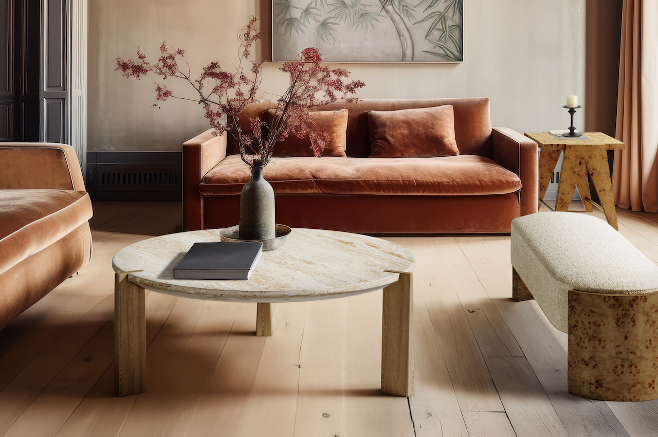 El uso de materiales naturales por parte de Lemieux et Cie enfatiza su conexión con la naturaleza y la simplicidad. La asombrosa belleza de la madera de nudo natural se encuentra en sillón dumas, Mesa de centro agrupada Rondely Banco Benoit. El travertino también es un material recurrente, que se encuentra en Mesa de centro Erin y Mesa consola diad.