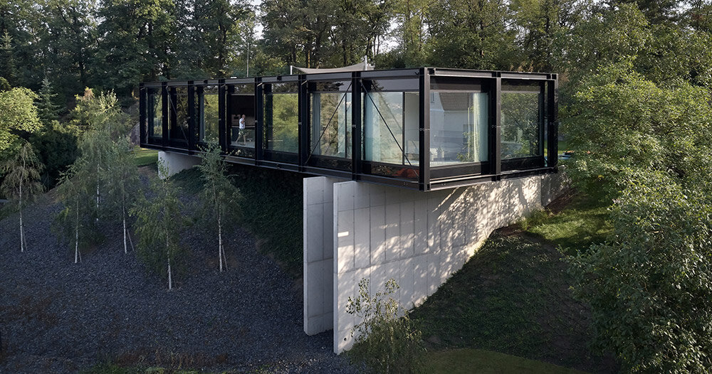 Para afrontar los desafíos del sitio web, arquitecto Stempel & Tesar Architekti se inspiró en las casas suspendidas para concebir Villa Sidonius. El edificio toma la forma de un puente, elevado sobre columnas de hormigón, similar a una pasarela de acero que atraviesa una pendiente. Este diseño estructural permite que la villa enfrente tanto el panorama norte como la luz del sol del sur, optimizando ambos aspectos de la ubicación.