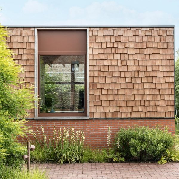 Externamente, la parte inferior del muro está revestida de ladrillo rojo, dando la impresión de hacer referencia a los zócalos de las casas vecinas, mientras que las tejas de cedro de arriba protegen el muro del agua de lluvia.