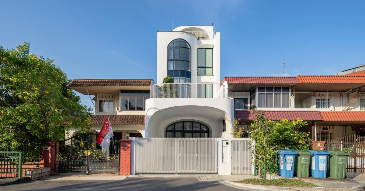 este estudio de singapur También hace eco del patrón arqueado de la fachada, que cuando se combina con las curvas de la fachada y las curvas de la planta, difiere de las fachadas tradicionales. Los arcos se curvan en un movimiento tridimensional, creando la ilusión de una torsión sin esfuerzo. Además, el porche para autocine cuenta con un techo abovedado rematado por una entrada arqueada. Mientras se maximiza el espacio arquitectónico para el propietario, la fachada se divide en formas superpuestas más pequeñas para crear una escala más humana. Está revestido de blanco, lo que permite que la belleza sencilla de la forma escultórica destaque entre su entorno ecléctico.