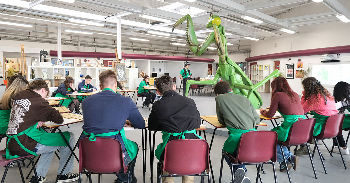 Gran escultura de mantis de Artista nominado al premio Turner La producción de David Shrigley contó con el apoyo del Departamento de Diseño del Beauchamp College. La escultura presenta una cabeza animada con ojos vigilantes y realistas que observan a los estudiantes que participan en clases de arte inspiradas en la pieza. Se espera que la instalación, titulada «Mantis Muse», impacte el plan de estudios en varias materias, con actividades extracurriculares adicionales planificadas en su presencia única, como kung fu y escultura de arcilla. Shrigley espera que la instalación genere un debate sobre la importancia de integrar las artes en el plan de estudios tradicional, que actualmente hace hincapié en la ciencia, la tecnología, la ingeniería y las matemáticas. A través de Mantis Muse, Shrigley pretende resaltar el importante papel de las artes en la educación y abogar por un apoyo más amplio a los programas artísticos en las escuelas de todo el país.