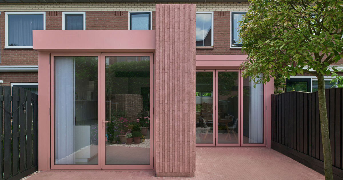 Rosa está diseñada por Atlas Arquitectos decoración y ampliaciones de los años 1960 Casa adosada en el autobús Países Bajoscombinando elementos de diseño contemporáneo con las características originales de la estructura. Hay calidez en el corazón de esta transformación. rosa específico Los bloques de mampostería sirven como anclajes visuales y elementos funcionales, incluidos gabinetes y una chimenea al aire libre. El proyecto amplió la cocina y el comedor, conectando el interior con el espacio exterior recientemente diseñado a través de amplias puertas plegables y una terraza rosa a juego. Esta consistente paleta de colores rosados cálidos define la identidad visual de Rosa, brindando un contraste suave pero llamativo con los ladrillos marrones originales de la casa.