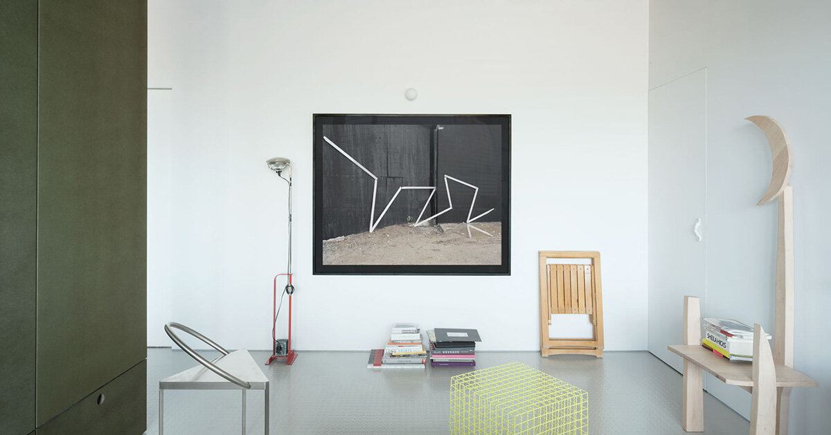 La paleta de colores industrial y poco ortodoxa explora la influencia de materiales fuera de los usos residenciales típicos. Los pisos están hechos de caucho Pirelli, un tipo que se encuentra comúnmente en entornos industriales, mientras que los techos están hechos de acero galvanizado removible, que se encuentra comúnmente en las oficinas. Juntas, estas texturas añaden calidad reflectante, realzando la luz natural en todo el interior y realzando el entorno abierto y adaptable. En Studiolo, HANGHAR finalmente incorpora el concepto arquitectónico de la propia habitación, considerando cómo el espacio puede combinar funcionalidad y contemplación.