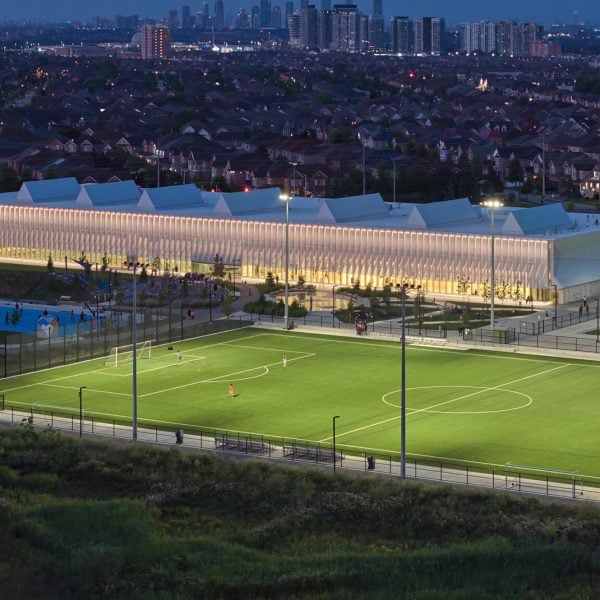 pilares de madera y neto la fachada está diseñada para imitar una “pantalla de árbol” polideportivo existir Canadá Diseñado por MJMA Architecture and Design Studio, con sede en Toronto.