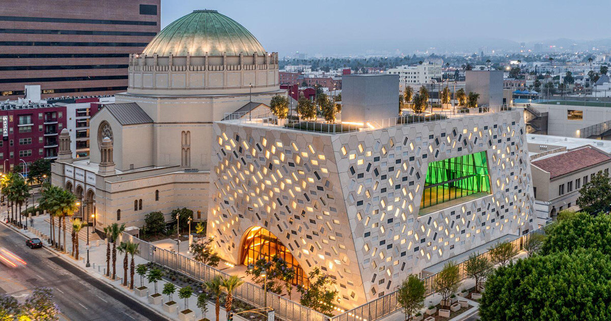 Diseñado por Shohei Shigematsu de OMA en colaboración con Gruen Associates, con sede en Los Ángeles, el pabellón de 55,000 pies cuadrados está diseñado para albergar una variedad de eventos, desde ceremonias religiosas hasta presentaciones comunitarias. Su forma trapezoidal, marcada por ventanas geométricas y terrazas empotradas de vidrio verde, crea un contraste visual dinámico con la arquitectura del Renacimiento bizantino del templo adyacente. La fachada se compone de formas hexagonales y tonos apagados, preparando el escenario para elementos de vidrio verde que resaltan el carácter contemporáneo del edificio y al mismo tiempo rinden homenaje a la cúpula verde del templo adyacente.