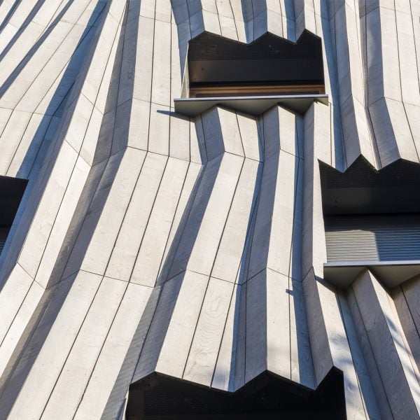 «Cada parte de la madera recibe la luz del sol según su trayectoria», continúa el estudio. «Esta fachada principal rompe la linealidad y anima la calle: una vibración especial que hace que este edificio sea único».