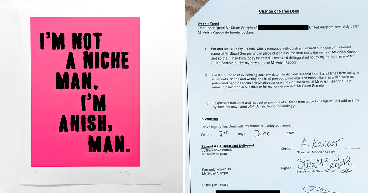 Semple sorprendió a Kapoor al cambiar su nombre por el suyo. Foto de Anish Kapoor vía @dirty_corner