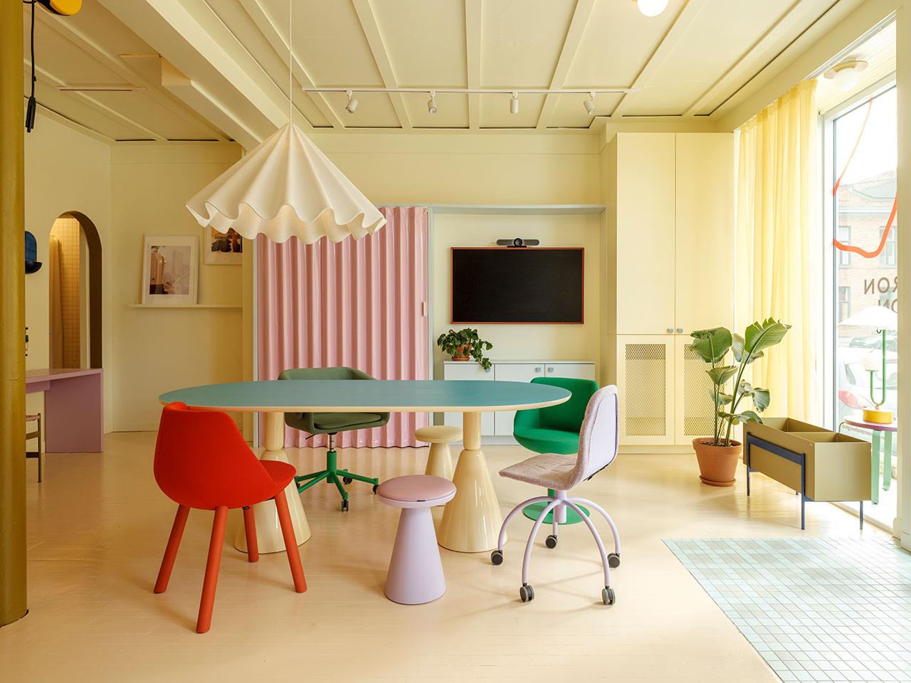 La fachada que da a la calle de Maison Perron refleja la creatividad del estudio. Con grandes ventanales que permiten a los transeúntes vislumbrar la boutique, el edificio sirve como sala de exposición y estudio. En el interior, los visitantes son recibidos por un área de recepción dinámica que se transforma sin problemas en espacios de trabajo y áreas de exhibición de boutiques. El diseño interior logra un equilibrio entre la funcionalidad comercial y un ambiente doméstico acogedor, con muebles y decoraciones cuidadosamente seleccionados de los socios internacionales de Perron inteligentemente integrados en todo el espacio.