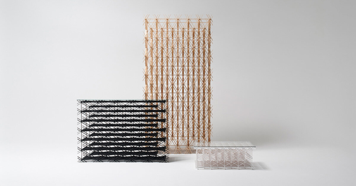 Arquitecto Koichiro Estudio de diseño Oniki (ODS) Lanzamiento de la colección de muebles Forêt Exposición de arte y diseño de Tokio 2024. La gama incluye una consola, un bajo mesaasí como divisores de inspiración tradicional. japonés Tecnología Kumiko. ODS aporta otra dimensión a la cultura tradicional japonesa Artesaníauno carpintería Técnica de montaje de patrones geométricos sin clavos. Forêt transforma las delicadas composiciones bidimensionales de Kumiko en muebles 3D. Esta reinterpretación se basa en el uso de pequeñas secciones transversales de madera para explorar la estabilidad estructural del triángulo equilátero, la forma fundamental de los diseños de Kumiko.