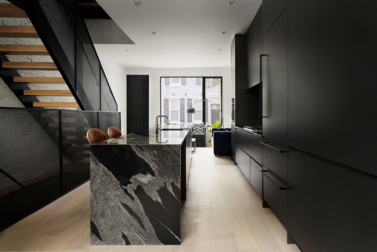 Las aberturas de vidrio de gran tamaño extienden el ambiente interior hacia el exterior, permitiendo abundante luz natural y manteniendo la privacidad. Con grandes ventanales en la parte delantera y trasera, la luz fluye a través de cada nivel, cambiando a medida que interactúa con las barandillas de acero perforadas de la escalera. Este enfoque logra niveles de iluminación raramente vistos en casas en hilera históricas de Filadelfia y apoya la ventilación pasiva, aumentando la comodidad en el entorno urbano.