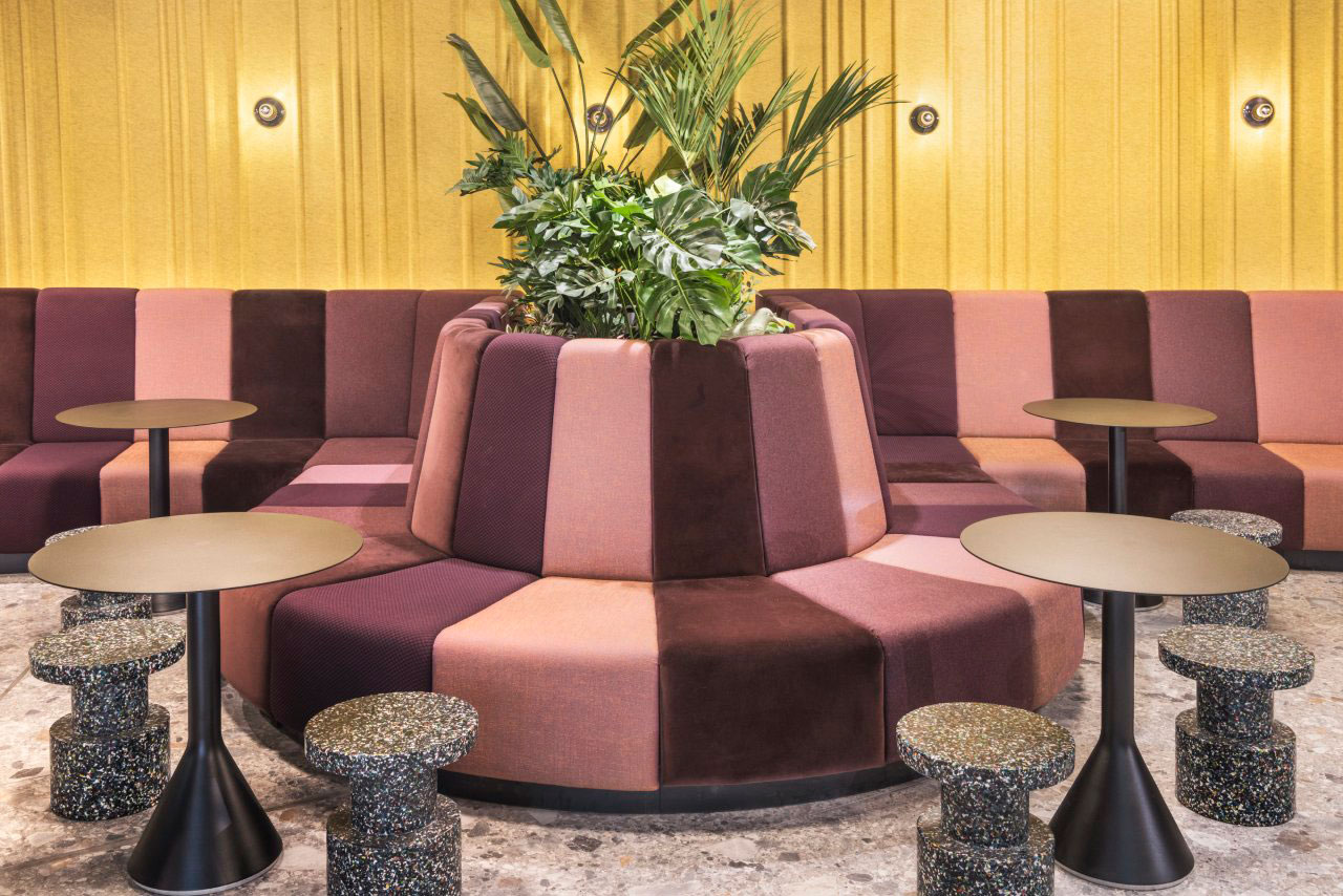 Una serie de rincones dignos de Instagram atraen a clientes de todas las edades. Los asientos a medida incluyen mesas y banquetas tapizadas con telas con estampados geométricos y sólidos que se alternan. En áreas comerciales de mucho tráfico, las superficies fáciles de limpiar son cruciales. Los adornos se mezclan y combinan para lograr una textura sutil. Las mesas de terrazo y madera lacada tienen un brillo sutil que complementa los taburetes y accesorios de iluminación de metal con recubrimiento en polvo mate.