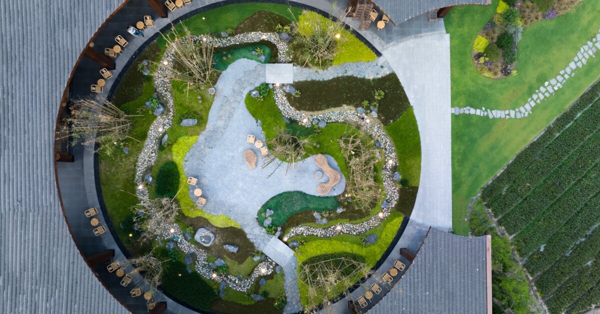 La abertura circular sobre el centro de visitantes realizada por arquitectos homme forma un jardín de bambú en medio de campos chinos.